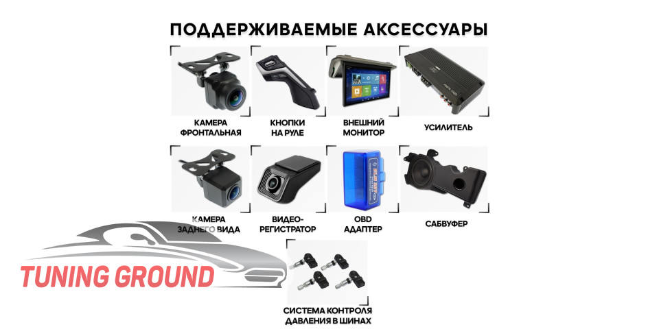 RCA выходы Front out, Rear out (опция), SW out (1.5В) / Rear Camera in, Aux In, Video in